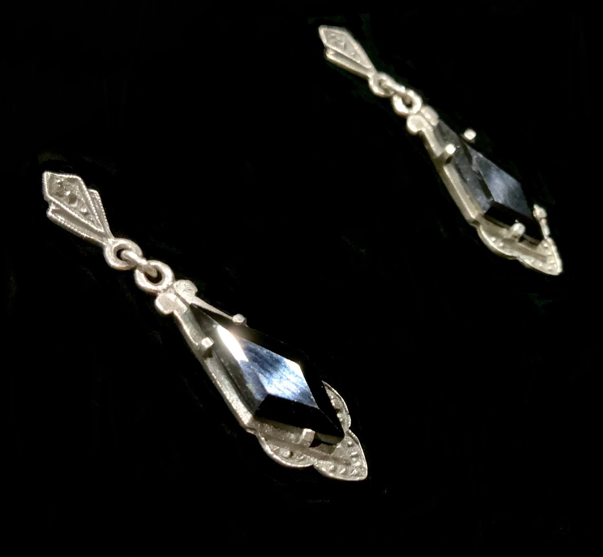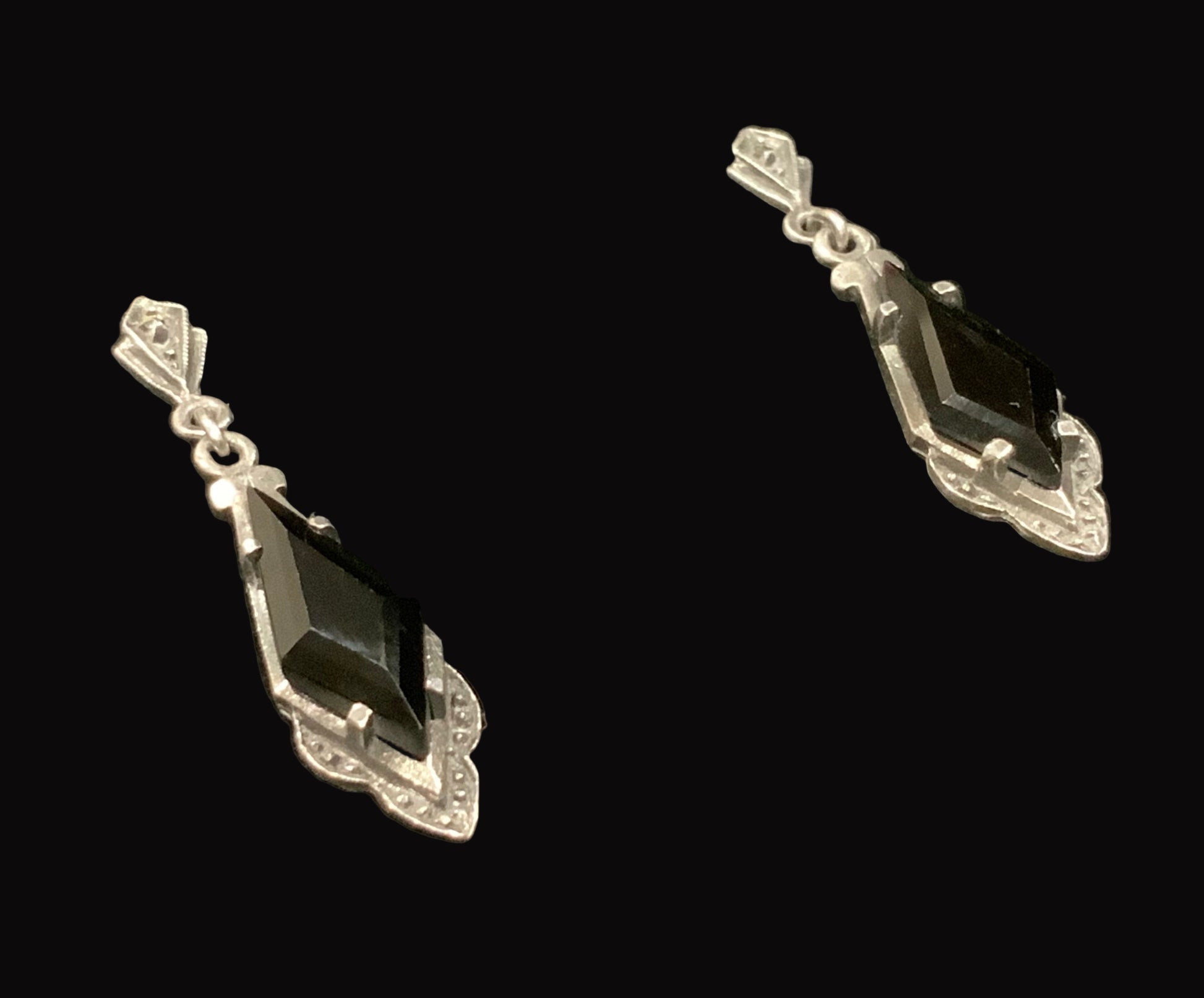 Antique Art Deco 925 Sterling Silver Black Onyx Dangle Earrings