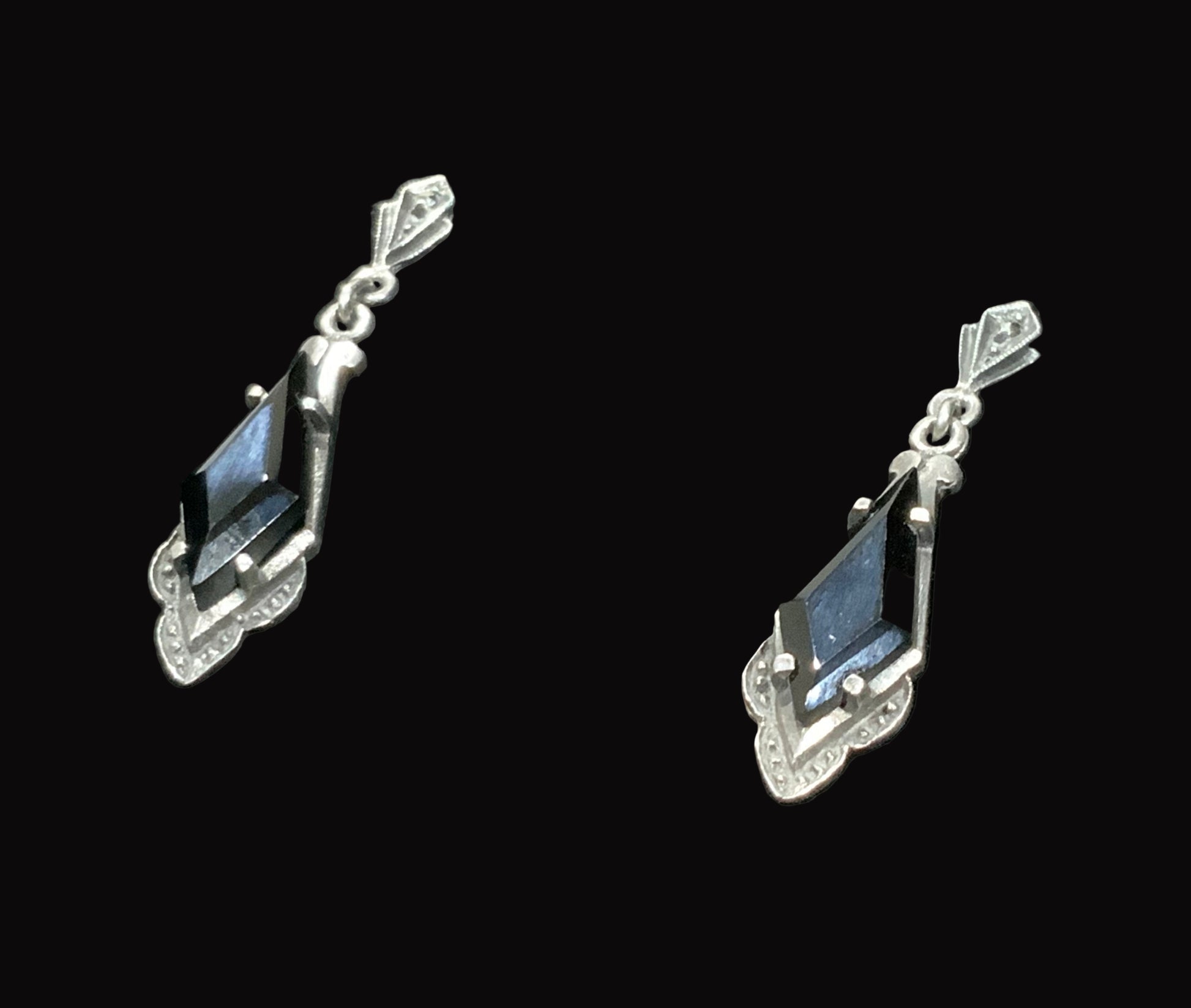 925 Sterling Silver Marcasite accent in the top section and prong set diamond shape Black Onyx dangles