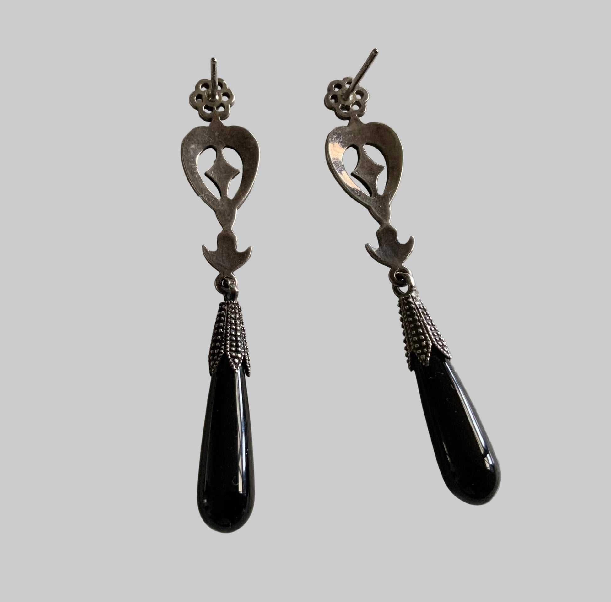 925 Sterling Silver decorated with Marcasites and finished with Black Onyx drops