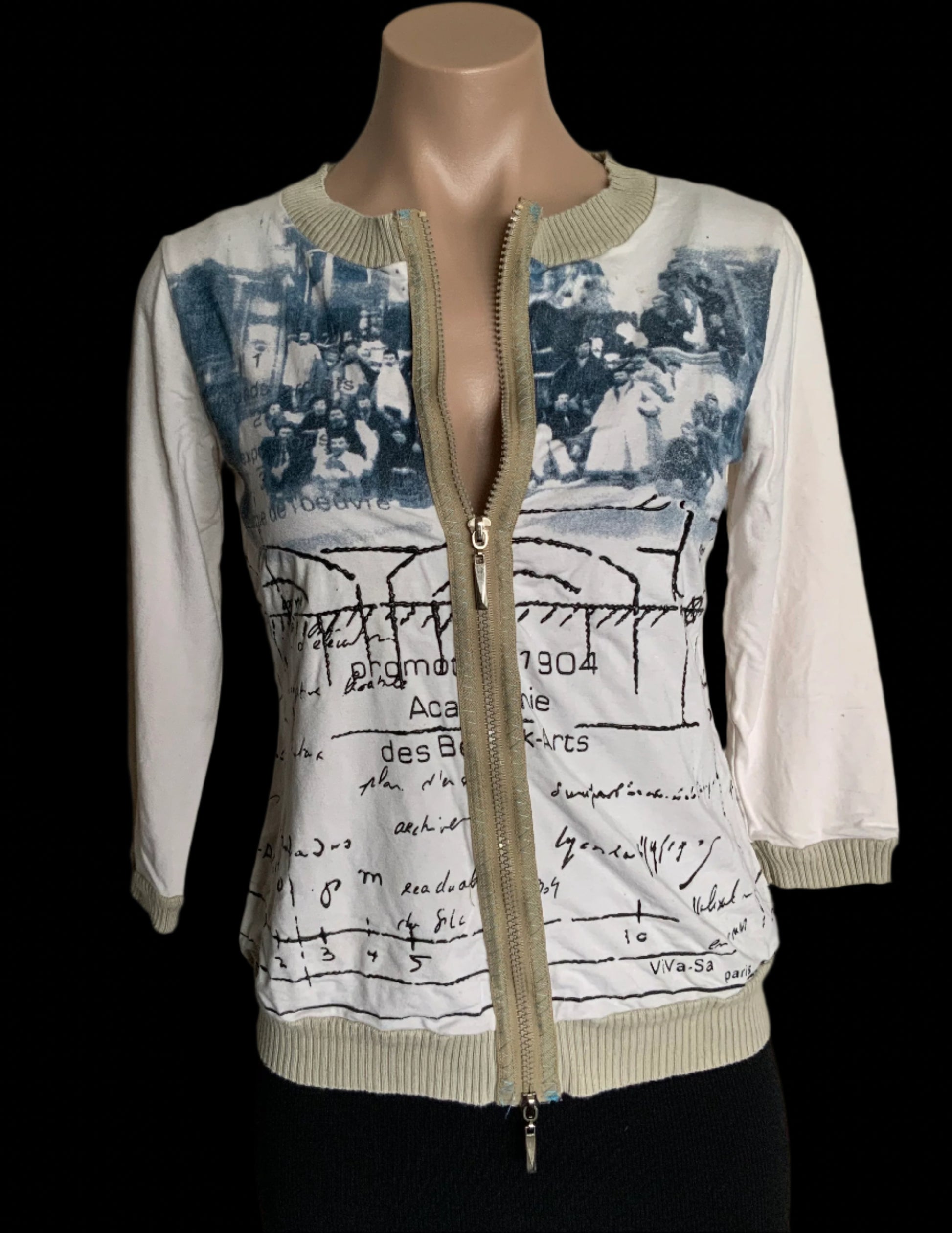 VIVA-SA Printed White 3/4 Sleeve Zip Up Top Size M Vintage Y2K